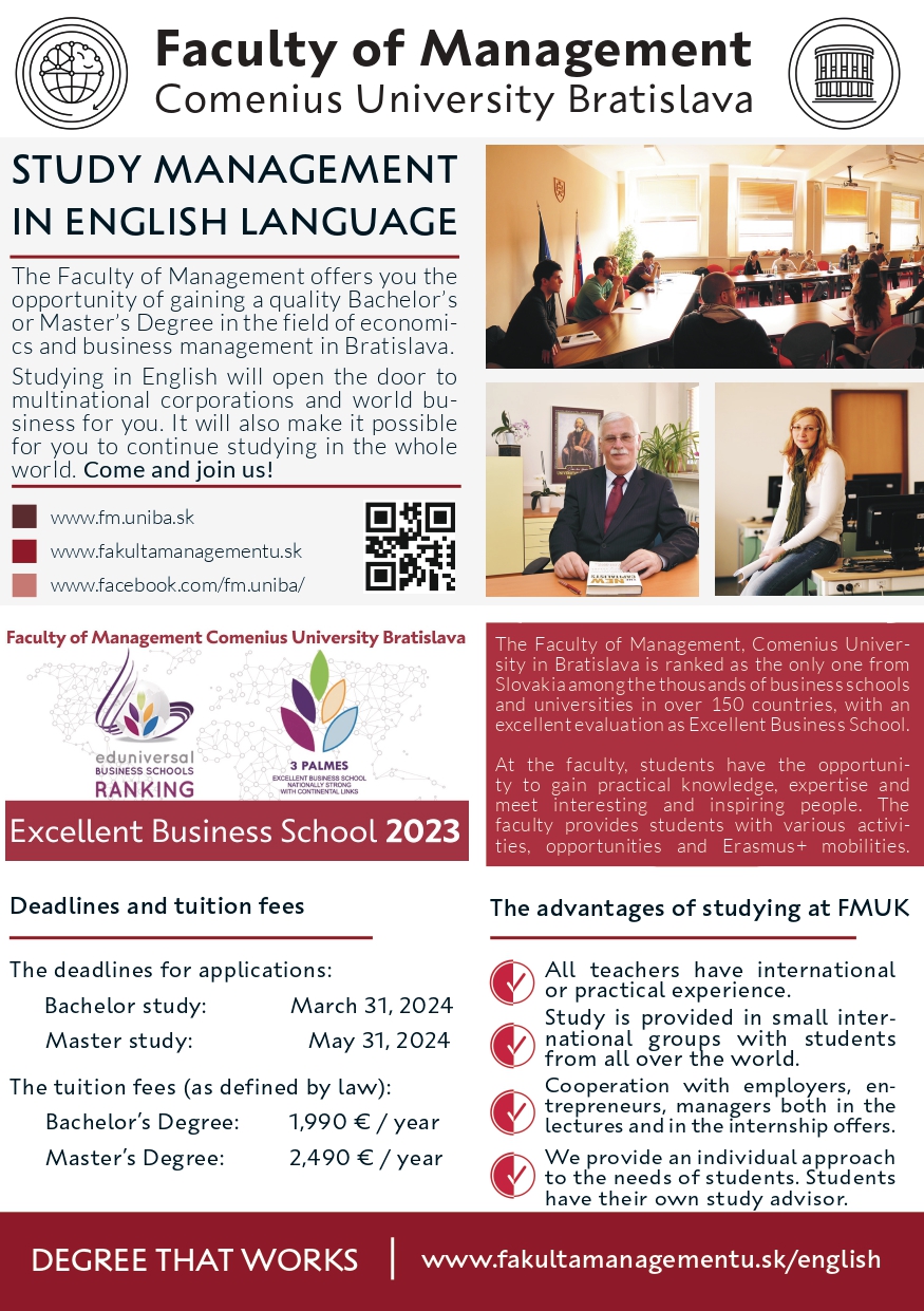 The mission of the Faculty of Management is to produce high-class and competitive graduates who are highly business oriented and able to work in teams or hold managerial posts in various organizations. Within its strategy, the faculty declares its idea to continue in current development and successful performance in the management study program and, as an integral part of Comenius University Bratislava, to contribute also to the research in the field of economics and business management.